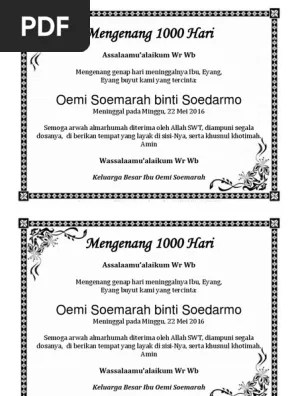 Mengenang genap hari meninggalnya suami bapak kami yang tercinta. Contoh ucapan 1000 hari orang meninggal word. Ucapan 1 tahun meninggal doc download ucapan tahlil 1000 hari word . Ucapan mengenang 1 tahun meninggal doc. Ucapan 1000 hari orang meninggal bahasa sunda ucapan memperingati 1000 hari orang meninggal ucapan 1000 . Template kartu ucapan 1000 hari orang meninggal doc kotak berkat tahlil microsoft. Contoh surat undangan tahlil 40 100 1000 hari haul doc. Format kartu ucapan yang kami bagikan ini adalah doc yang bisa diedit menggunakan . Contoh undangan tahlilan 40 hari meninggalnya. Silahkan download ucapan di kotak nasi 40 hari word. 27 contoh ucapan mengenang 1000 hari orang meninggal kata bijak kreatif. Download disini demikianlah yang dapat kami tulis dan cantumkan mengenai contoh undangan 1000 hari orang meninggal word semoga dapat bermanfaat . Cara download ucapan mengenang 40 hari orang meninggal.